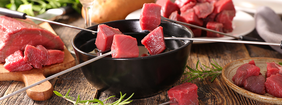 Wie wär´s mal wieder mit Fondue? Eine Auswahl an angemachten Salaten, Fleischfondue (Brühe) mit Rind, Schwein und Geflügelfleisch, Fischfondue (Brühe) mit Lachs, Zander und Garnelen, diverse Saucen und Dips sowie verschiedene Brotsorten.