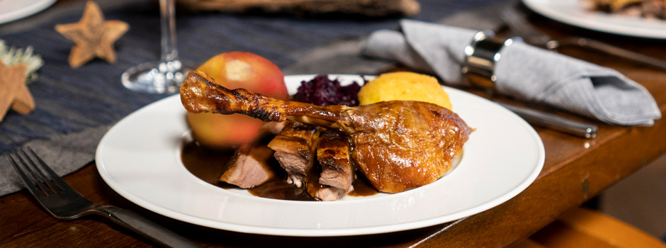 Geschmorte Gans aus dem Ofen mit Orangenjus, Apfelrotkohl, Kartoffelklößen und Maronen